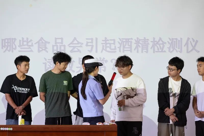 接着,主讲人季红秋同志结合自身的工作经验,通过PPT展示、知识讲解、案例分析等形式,向同学们普及了交通法规及安全知识。讲座中还模拟了一些常见的交通场景,让同学们在实际操作中学习和掌握交通安全知识。同学们积极参与,通过模拟话术的方式,模拟了在道路上可能遇到的各种情况,并学会了如何正确应对和处理。同时还设置了知识问答、酒精呼气测试、疲劳驾驶“盲行”等活动环节,同学们积极参与。在活动现场,交警大队的同志们还为同学们准备了精美的礼品,警民互动,寓教于乐,现场氛围热烈。