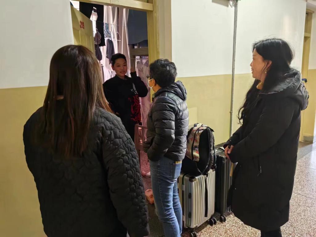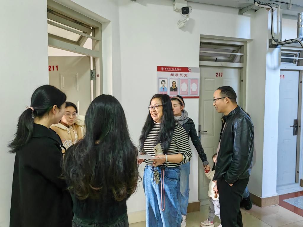在宿舍区域,检查组与宿管老师们一同深入宿舍,看望未离校的同学,检查无人宿舍的门窗、电源关闭情况,特别提醒未离校同学注意个人财物安全,叮嘱同学们离校前务必锁好门窗,安全返家。