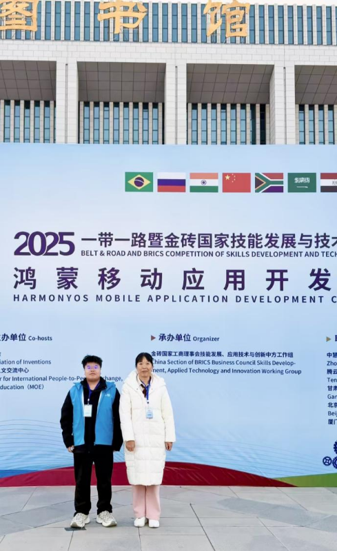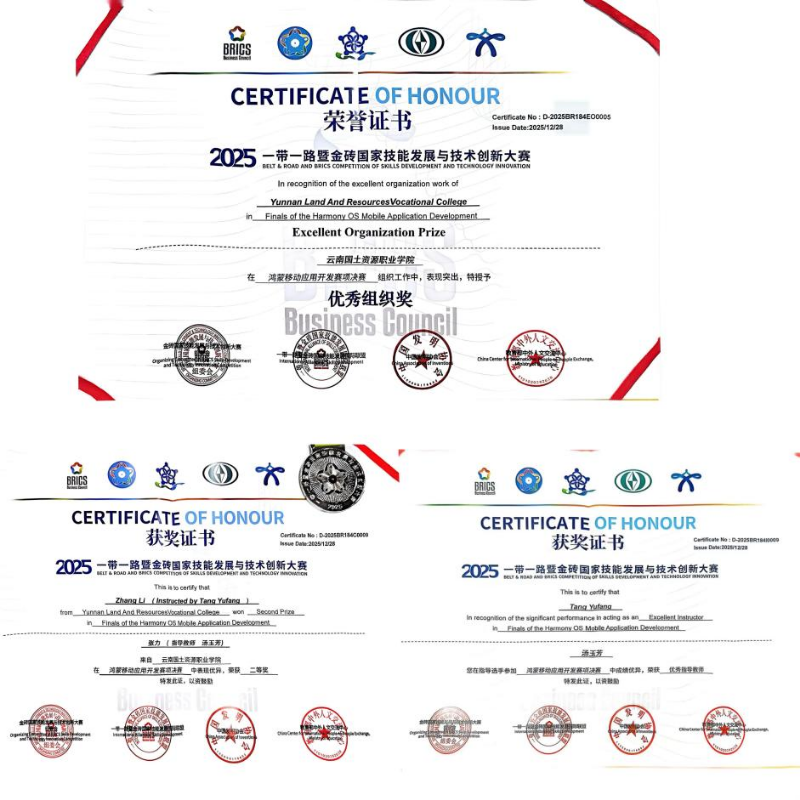 近日,2025一带一路暨金砖国家技能发展与技术创新大赛“鸿蒙移动应用开发”赛项全国总决赛在甘肃省兰州市圆满落幕。本次大赛吸引了全国69所大专院校的近138名师生同台竞技。经过激烈角逐,由z6mg人生就是博官网教师汤玉芳老师指导、23级移动互联技术3班张力同学组成的参赛队凭借扎实的专业功底、娴熟的编程技能和突出的创新思维,斩获该赛项二等奖。同时,汤玉芳老师荣获“优秀指导教师奖”,z6mg人生就是博官网荣获“优秀组织奖”。