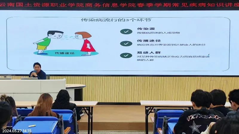 周开明医生首先介绍了春季传染病的危害,强调远离传染源的重要性。他提醒师生们,在春季传染病高发期,要尽量减少外出,特别是避免去拥挤的公共场所,如商场、超市等。此外,还应远离患有传染病的人群,以降低感染风险。