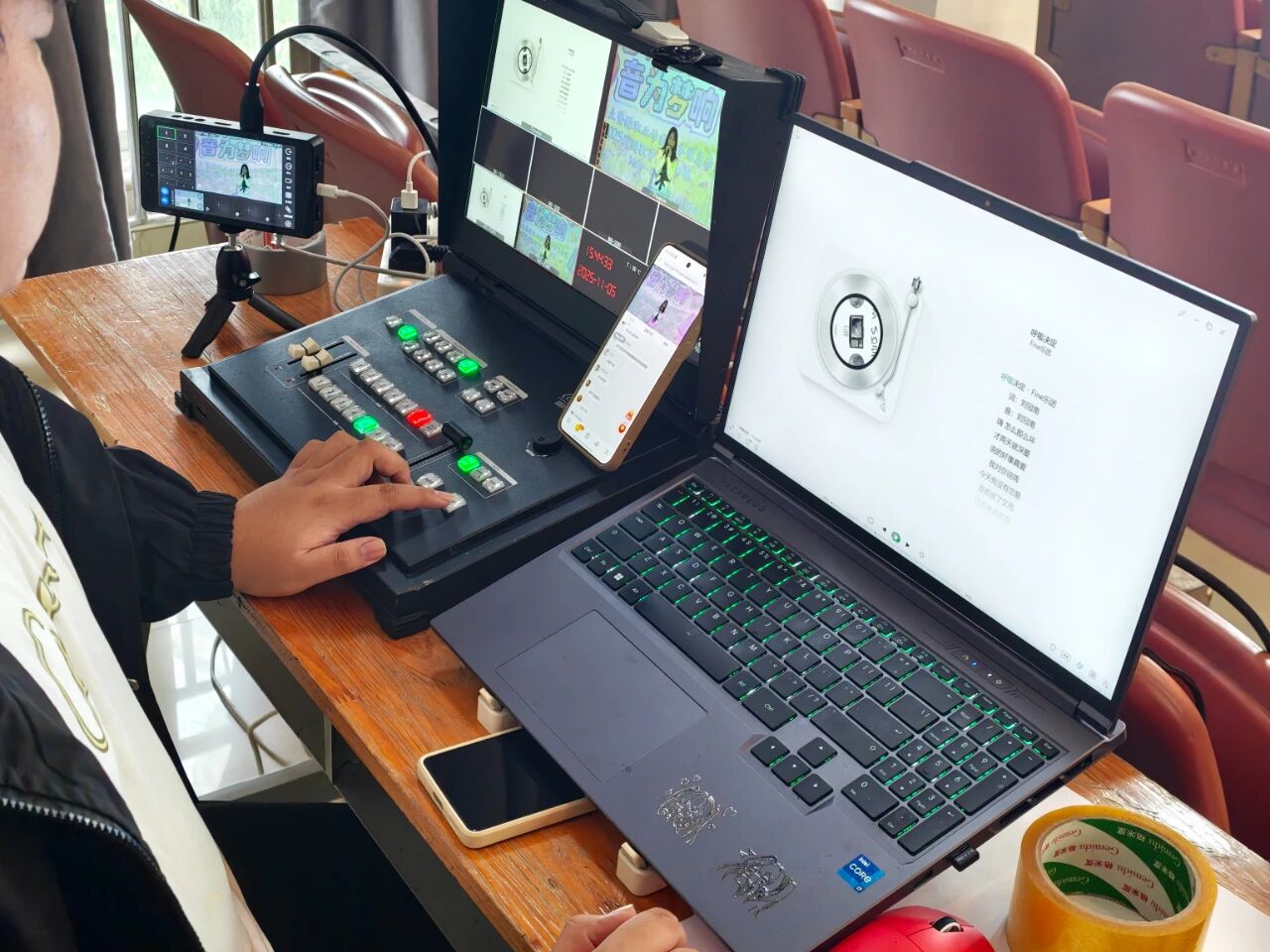 活动筹备阶段,数媒4班的同学们便充分施展专业特长,将音效与装饰元素巧妙融合,精心打造出一个如梦如幻且充满活力的舞台,为参赛歌手营造出绝佳的表演氛围。在直播搭建环节,大家秉持严谨细致的态度,对设备进行反复调试,不放过任何一个细节,力求确保直播画面清晰、声音流畅。每一个精心的调试,都凝聚着班级成员的心血与智慧,只为呈现最具视觉冲击力的舞台效果。