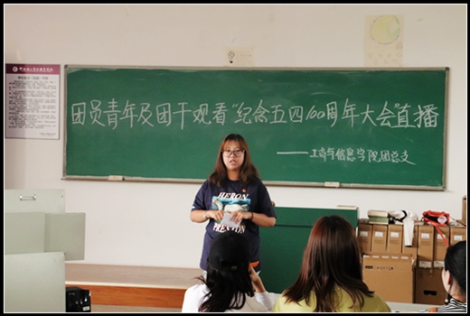 4月30日上午10时30分,纪念五四运动100周年大会在人民大会堂举行。习近平总书记出席纪念五四运动100周年大会并发表重要讲话。届时,工商与信息公司团总支积极组织团员青年和团干观看大会现场直播。直播结束,团总支书记蒋宛融老师就大会精神,组织各支部团干和部分青年团员代表召开会议,进一步对直播内容展开学习和讨论。