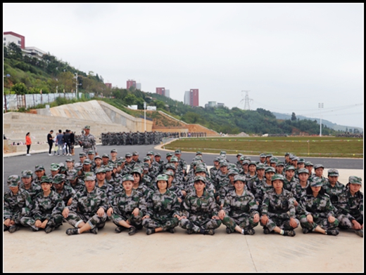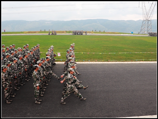 走进训练场时,教官们严格要求新生整理军容和端正军姿,不时亲自示范,并手把手纠正基本的动作,同学们在英姿飒爽的教官的带领下认真训练,丝毫没有半点偷懒。绿茵茵的草地和橄榄绿的迷彩军装交相辉映,一群身着迷彩的活力青年整齐地站着军姿,有力地踏着正步,响亮地喊着口号,激昂地唱着军歌。