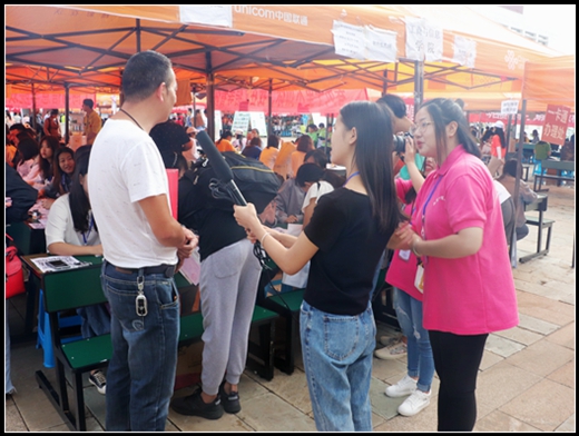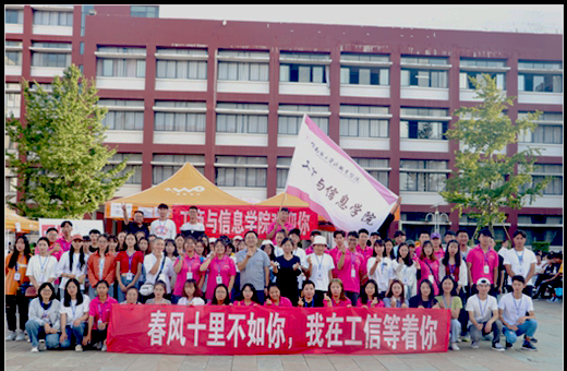 阴天没有晴日的明朗,却依然明亮,早上7点半公司开始在迎新点布置迎新帐篷,准备迎接新生。横幅、院旗、报名流程图、公司详情介绍图等等都向新生展示了工商与信息公司的新风貌、新朝气。18级学长学姐身着院服,或举着公司牌子,或穿梭在校园的各个角落,随时为有需要的新生或家长提供帮助,带领新生到公司接待处报到、寻找宿舍、食堂等,让他们能够顺利的完成入学报到。