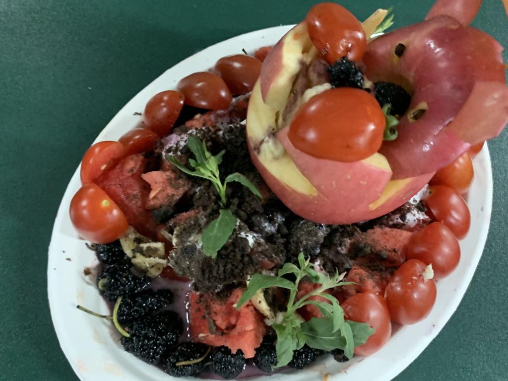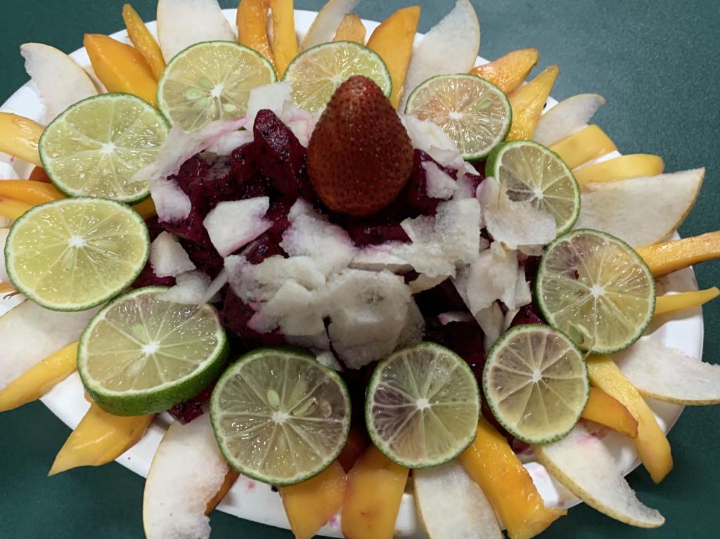 水果摆盘环节,同学们以宿舍为单位一起完成水果摆盘设计,不在同一间宿舍的同学也临时组队用不同的水果摆出了一种动物,象征着虽然他们没有在一个宿舍也还是能够团结起来,正如各族人民大家庭的紧密团结。