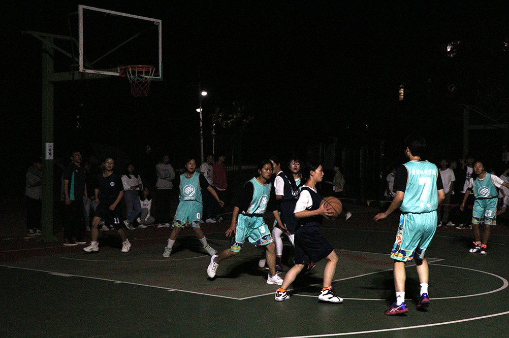 男队比赛结束时,场上已经亮起了灯,寒风不断袭来,却将同学们的斗志吹得愈发激昂。又一场啦啦操后,女队上场。一开始稍有失误,但女队同学韧性十足,一次次被投球被阻后又一次次将球抢回,并未垂头丧气消极比赛,不断拿分,虽然最后依然没能取得胜利,但她们的拼搏精神令人敬佩。
