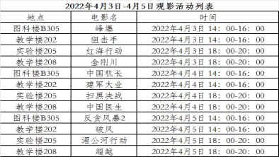公司在2022年4月3日-4月5日期间分别在图科楼B305、教学楼20、教学楼208、实验楼205开展电影观影活动,具体影片、观影地点及时间请详见上图,欢迎大家届时到场观影。