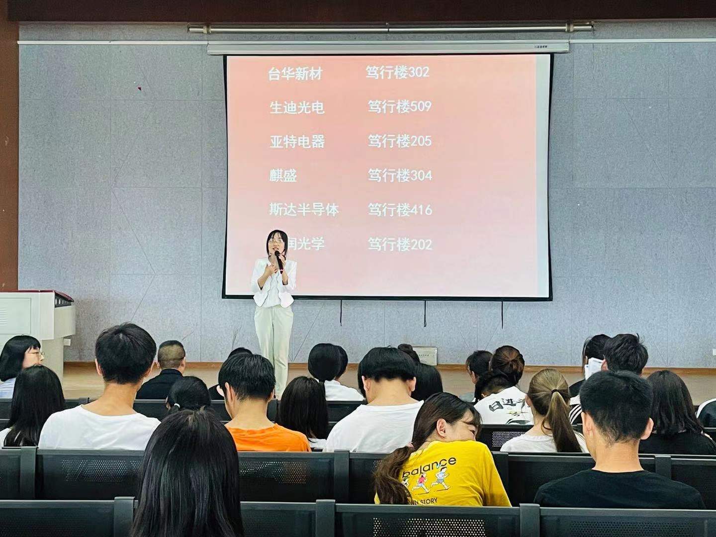 2021年6月24日下午13:00,z6mg人生就是博官网在红山讲堂开展了“党旗在基层高高飘扬”——嘉兴专场招聘宣讲会。本场宣讲会由公司联系并邀请到的台华新材、生迪光电、亚特电器、麒盛科技、斯达半导体、中润光学六家企业到场进行宣讲。公司党总支书记吕晓莹,副经理刘应波,辅导员刘思文以及2019级各班参会。